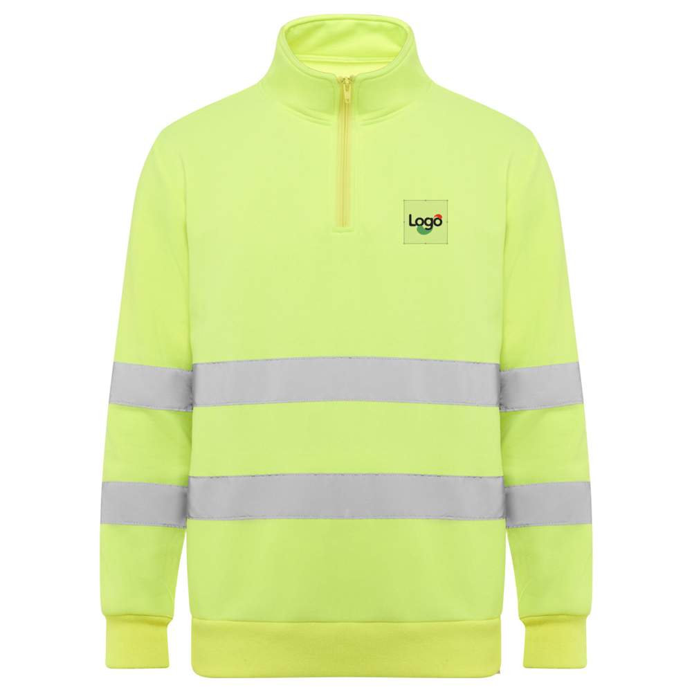 The high visibility Spica Sweat from ROLY WRK offers excellent visibility and comfort. With a high collar with chin guard and zipper, it ensures optimal protection. Two horizontal reflective strips on the chest and sleeves improve visibility in low light conditions. A reinforced clean strip inside the neck ensures increased durability. The detachable label allows for easy marking. This garment is CE certified according to EN ISO 13688:2013/A1:2021 and EN ISO 20471:2013/A1:2017, class II. The ribbed cuffs and hem provide a comfortable fit. Possibility of customization with embroidery or by adding your logo.