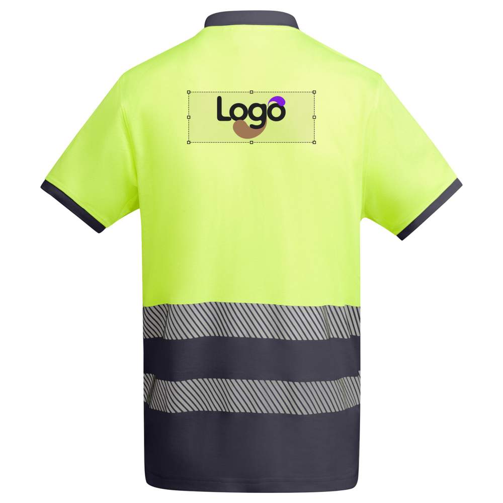 Short-sleeved high visibility technical polo, ideal for improving safety and comfort. Contrasting collar and sleeves in ribbed fabric for a modern look. Two segmented high visibility bands on the chest for better recognition. Contrasting button placket with three buttons for easy wearing. Comfortable blended fabric of polyester and cotton for optimal breathability. Possibility to customize with your logo by embroidery or print for a unique brand image. CE compliance according to standards EN ISO 13688:2013/A1:2021 and EN ISO 20471:2013/A1:2017. Class I: 55221 - 55223 - 52221 - 23221. Class II: 221 - 223.