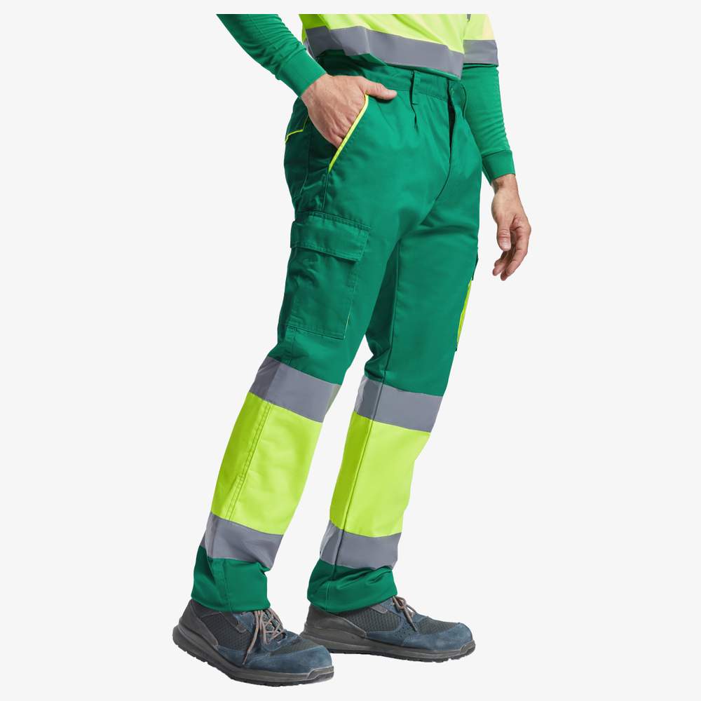 Doubled high visibility work pants with multiple pockets. Bicolor model with high visibility bands. Contrasting details on pockets. Fleecy lining. Elastic waistband at the back. Two front pockets. Two rear pockets with flap and Velcro closure. Two side pleated pockets with flap and Velcro closure. CE compliance according to the following standards: EN ISO 13688:2013/A1:2021 and EN ISO 20471:2013/A1:2017. Class I.
