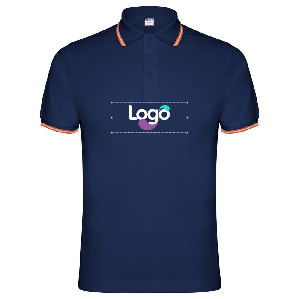 Short Sleeve Nation Polo, made with a jackard collar and sleeve edges, featuring a three-button placket. A neck tape is present at the collar. A flag detail is embroidered on the back, and an optional pocket can be added. The label is detachable for added comfort. This polo offers an excellent base for embroidery customization, allowing you to incorporate your logo or graphic elements for a consistent and professional brand image. Composition: 65% polyester / 35% cotton.