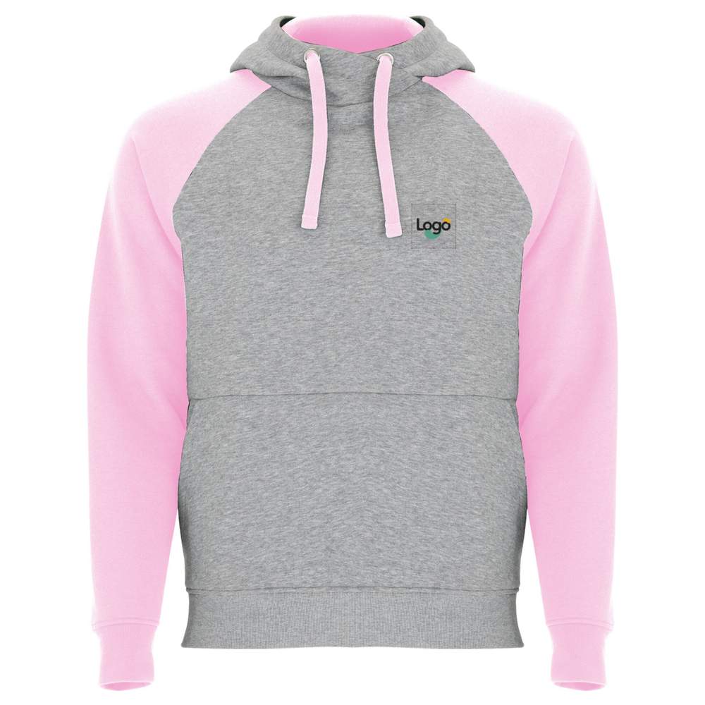 Bi-color unisex sweatshirt. Hooded with crocheted collar and metal eyelets, contrasting interior and cords. Contrasting raglan sleeves. Kangaroo pocket. Cuffs and hem in ribbed elastane 1x1. Detachable label. This sweatshirt offers an ideal surface for customization by embroidery or printing of your logo, thus creating an effective and original communication medium. Composition: 50% cotton, 50% polyester