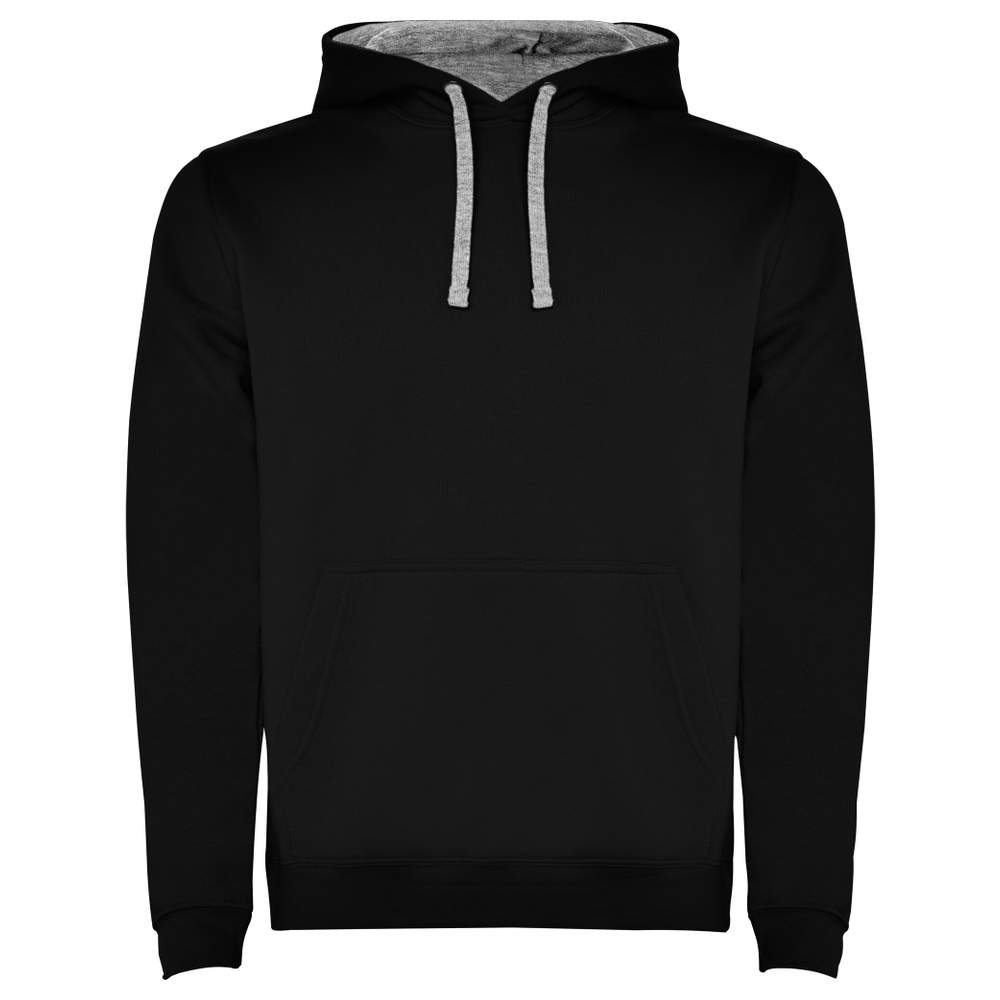 Two-color sweatshirt with lined hood and contrasting drawstring. Kangaroo pocket. Elastane cuffs and waistband in 1x1 rib. Child's model without drawstring. Detachable label. Duo Concept. Composition: 50% cotton, 50% polyester (except heather gray color: 55% cotton, 40% polyester, 5% viscose), fleece knit.