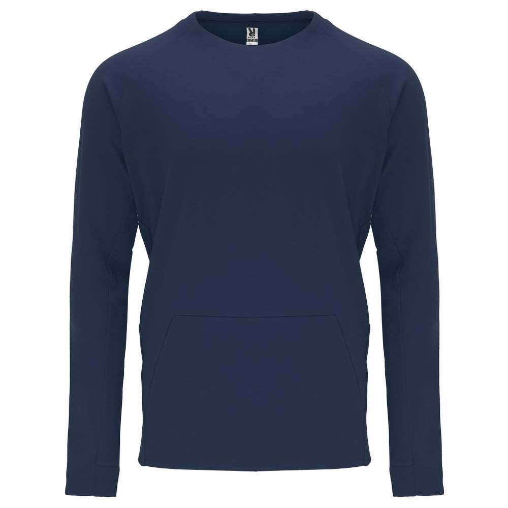 This long sleeve sweat features a modern raglan cut. It has a kangaroo pocket for added comfort and diagonal side seams that enhance its line. The back of the collar and the cuffs are made with 1x1 ribbing for better hold. This model combines comfort and style for versatile use.