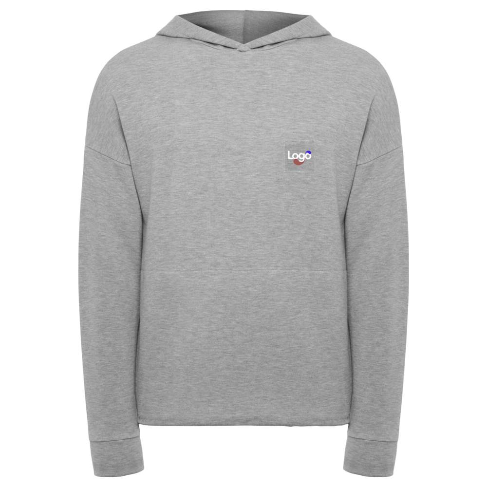 Lightweight unisex hooded sweatshirt, without drawstring. Presence of side pockets and cuffs and back waist in main fabric. Removable label for optimal comfort. This sweatshirt is ideal to be combined with the IRIA pants. Composition: 50% modal, 43% polyester, 7% elastane. Possibility of customization in embroidery to display your logo or your visual. Side pockets, cuffs and back waist in main fabric, removable label, unisex style