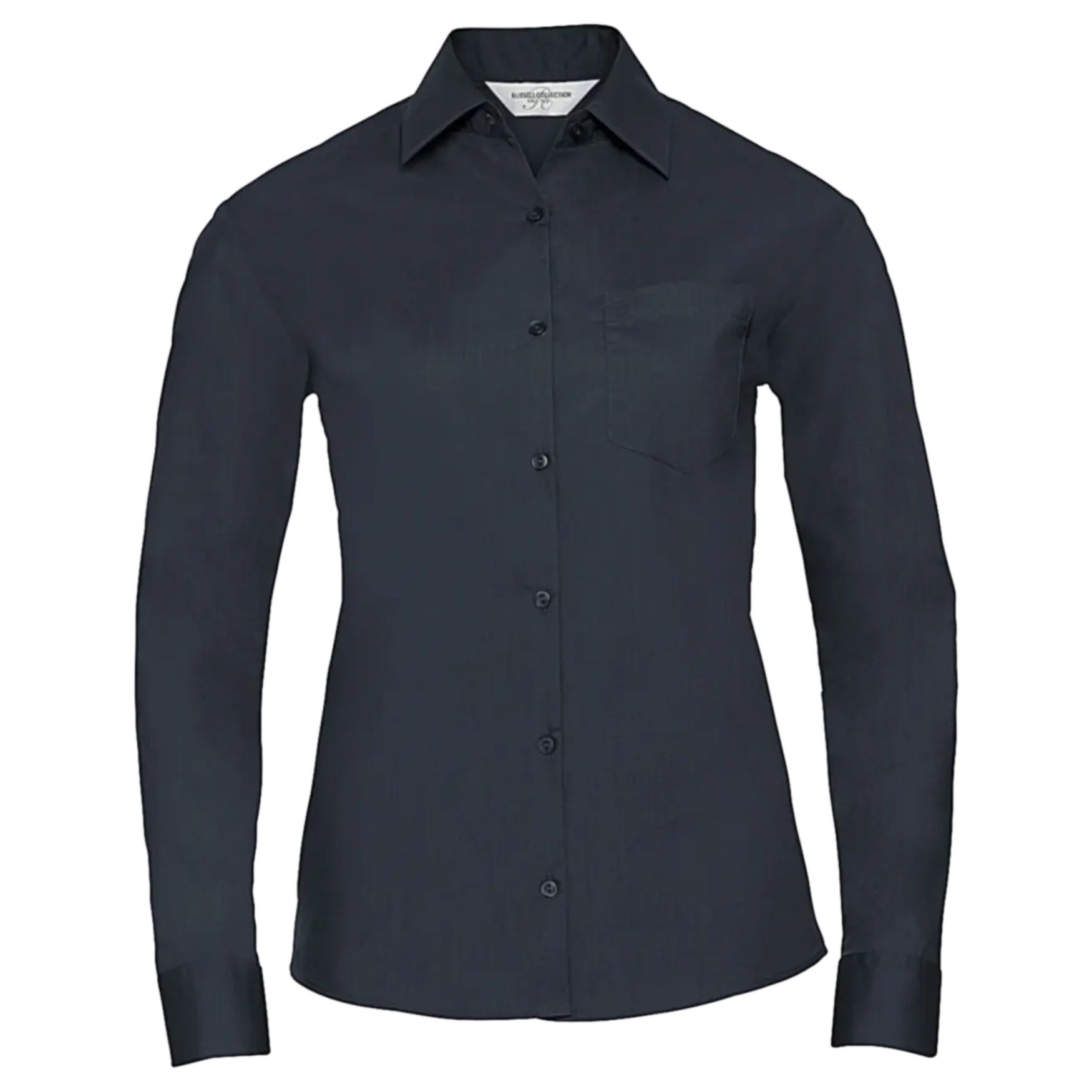 The women's poplin long sleeve shirt features a classic single-button collar and tone-on-tone buttons. It includes a chest pocket and adjustable rounded cuffs with two buttons. The fit is classic with a slightly rounded hem. Composition is 65% polyester, 35% cotton.