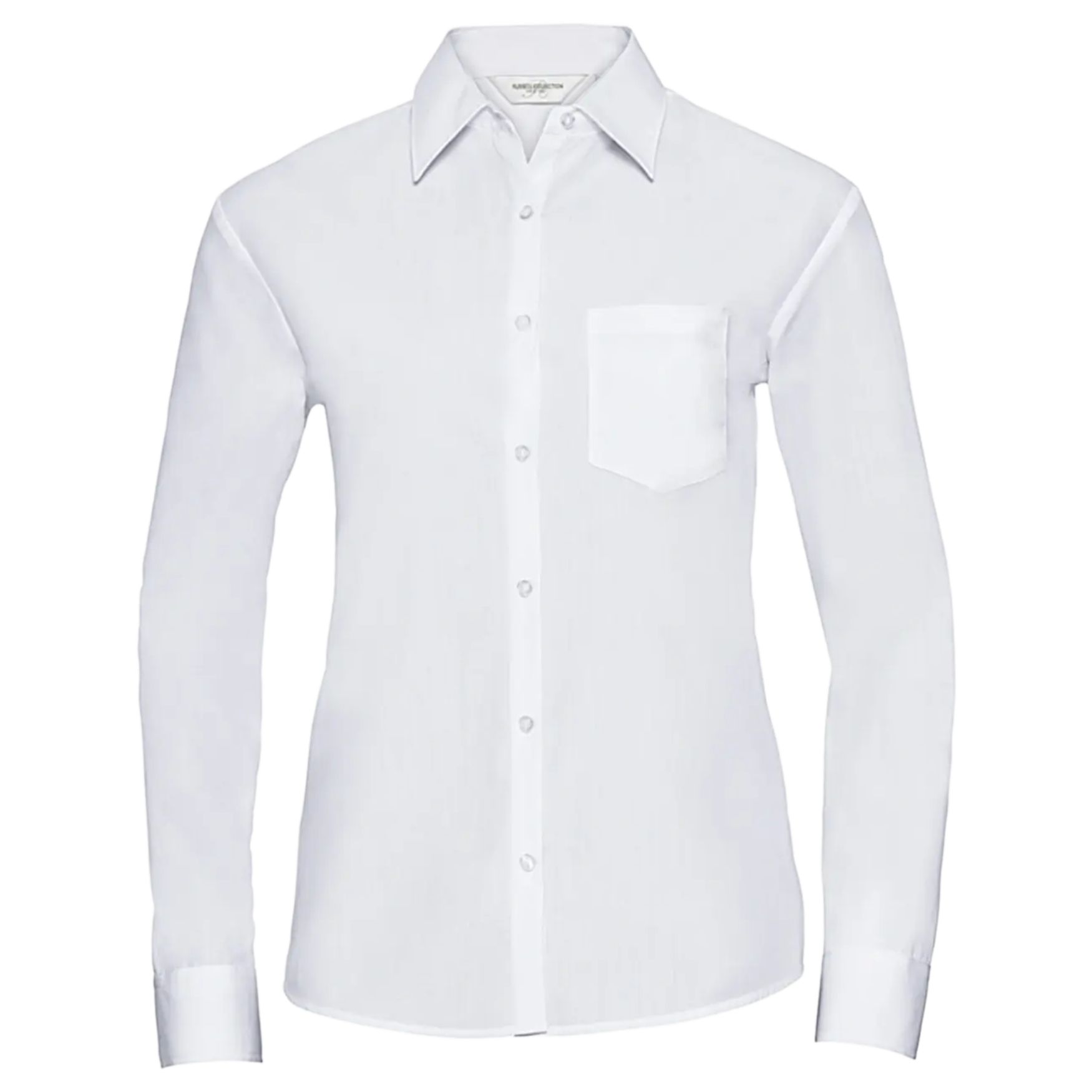 The women's poplin long sleeve shirt features a classic single-button collar and tone-on-tone buttons. It includes a chest pocket and adjustable rounded cuffs with two buttons. The fit is classic with a slightly rounded hem. Composition is 65% polyester, 35% cotton.