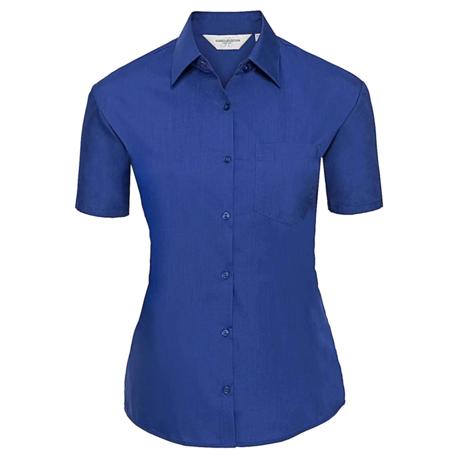 The short sleeve shirt for women is made of poplin composed of 65% polyester and 35% cotton. It features a classic cut with a slightly rounded hem, a classic collar with a single button and a chest pocket. The buttons are tone-on-tone.