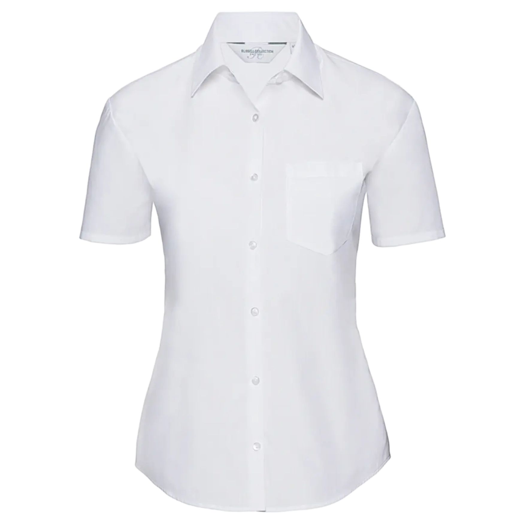 The short sleeve shirt for women is made of poplin composed of 65% polyester and 35% cotton. It features a classic cut with a slightly rounded hem, a classic collar with a single button and a chest pocket. The buttons are tone-on-tone.