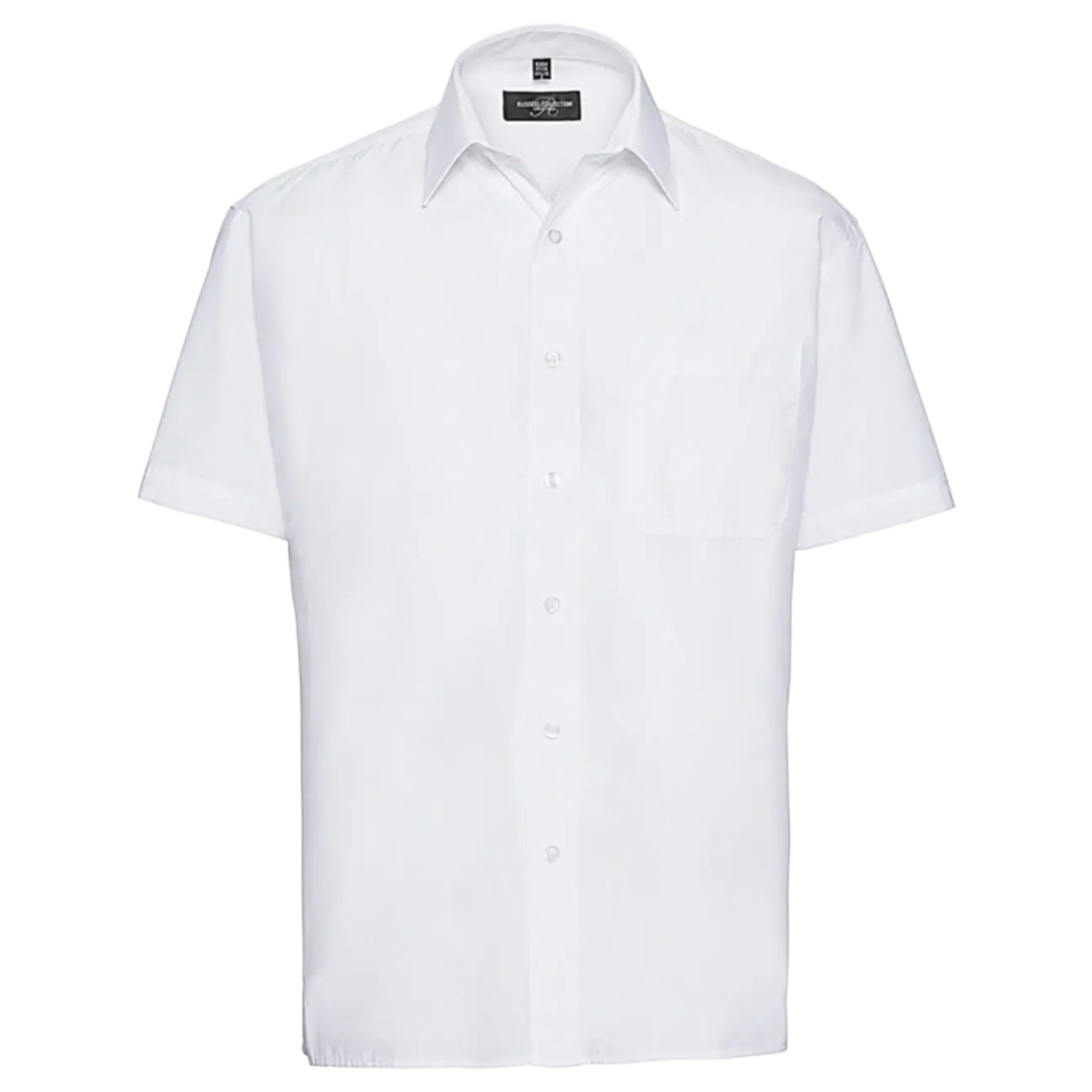 The short sleeve shirt is made of poplin composed of 65% polyester and 35% cotton. It features an Italian collar, tone-on-tone buttons, a shoulder yoke with two inverted pleats, a chest pocket and a classic straight hem cut.