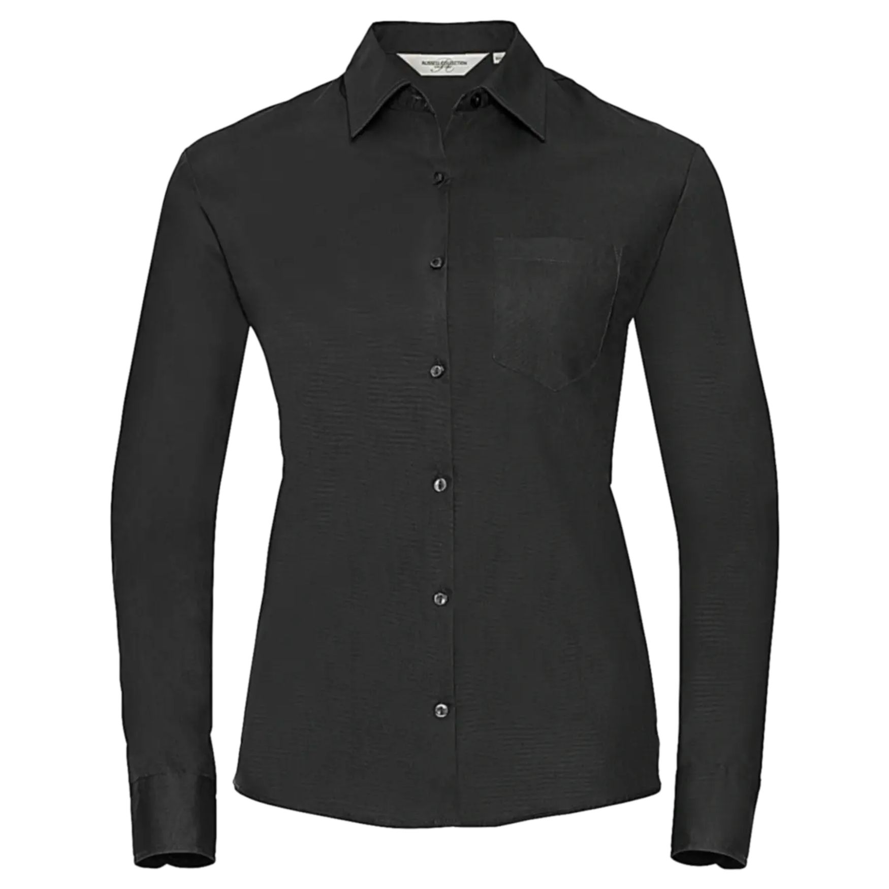 The women's long sleeve shirt is made of 100% cotton poplin. It features a classic collar with matching buttons, a V-shaped chest pocket, and a shoulder yoke with two inverted pleats. The cut is classic with a straight hem and buttoned cuffs. Spare buttons included.
