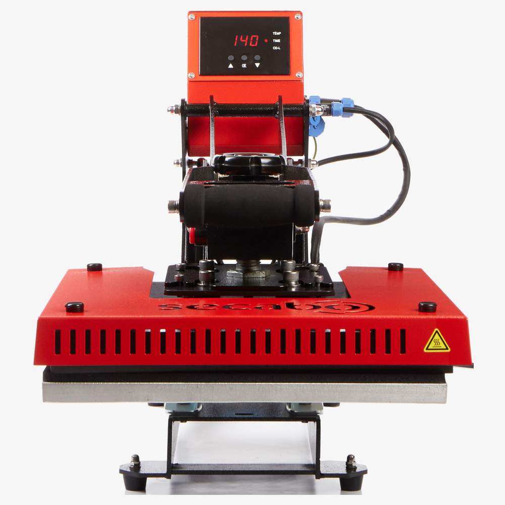 The TC5 LITE hot press is a modular electromagnetic press with a book opening format of 38cm x 38cm. It allows the execution of other tasks during pressing thanks to its automatic opening system. The pressing process can be interrupted at any time by pressing a push button, for example for the pre-pressing of textiles. The temperature and pressing time are easily selectable via the digital display. The pressure adjustment knob facilitates and accelerates the setting according to the printed support. The control unit, heating plate, lower plate and frame can be disassembled and replaced in a few simple steps. The TC5 LITE hot press can be used on T-shirts, mouse pads, puzzles, ceramic tiles and all other flat surfaces using Flex, Flock, transfer paper, sublimation and screen printing. The new electromagnetic mechanism ensures ease of use and increased productivity thanks to the automatic lifting at the end of the timer, offering the comfort of a pneumatic press without the use of a compressor.