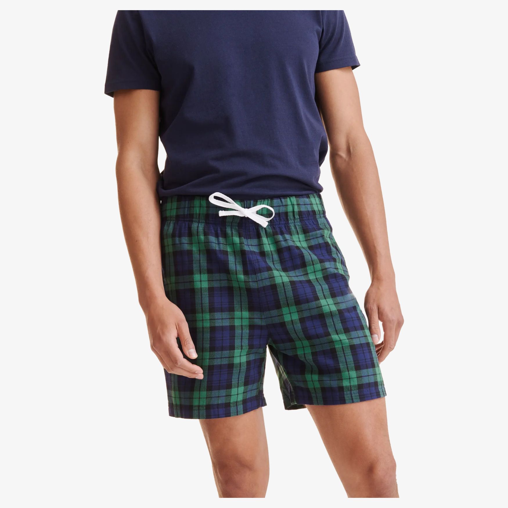 The Men's tartan lounge shorts is a men's lounge short made of cotton. It features an elastic waistband with contrasting drawstring and a patch back pocket. The hem is flat and the label is removable.