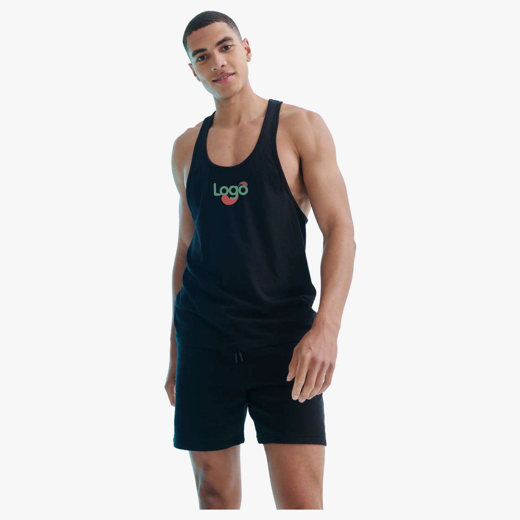 The men's vest features a long cut with a racerback. It has matching fabric trim around the neckline and armholes and a straight double-stitched hem. The detachable label allows easy rebranding. The composition is 60% cotton and 40% polyester, except for the heather grey color which is 85% cotton and 15% viscose.