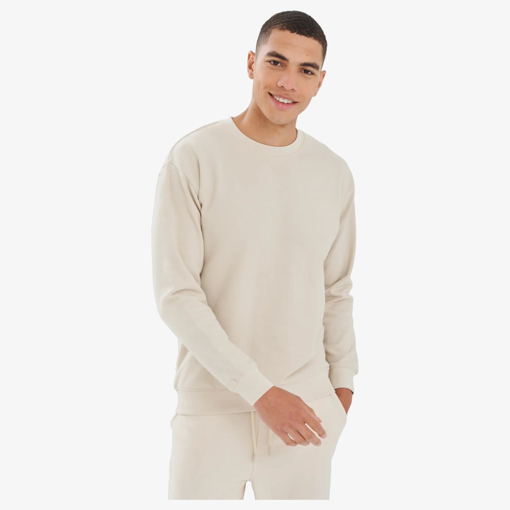 The unisex sweat is made of regenerated cotton and recycled polyester. It includes straight sleeves, dropped shoulders, round neck, and ribbed cuffs. The back is longer than the front and the interior is brushed for a specific touch. A clean finish band in single jersey is applied to the collar with tone-on-tone topstitching.
