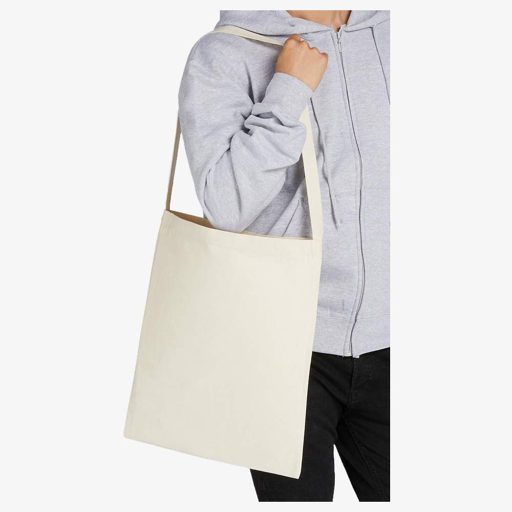 Cotton shopping bag unique handle. Original version of the classic tote bag, this versatile bag is solid and durable thanks to the cross stitch on the handle. Internal seams with overlock stitching. Long handle: approx. 85 cm. Dimensions: 38 x 42 cm. Composition: 100% Cotton.