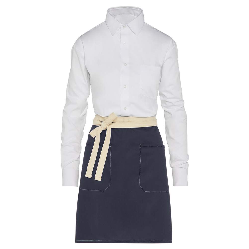 This bistro apron in poly cotton is designed for professional use. It is available in trendy colors and features natural-colored contrast ties. It is equipped with two practical separate pockets with a design cut and natural-colored contrast stitching (each: 20 x 20 cm). Its dimensions are 78 x 52 cm.