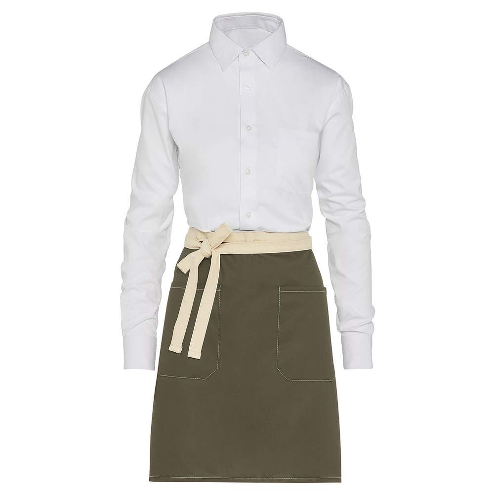This bistro apron in poly cotton is designed for professional use. It is available in trendy colors and features natural-colored contrast ties. It is equipped with two practical separate pockets with a design cut and natural-colored contrast stitching (each: 20 x 20 cm). Its dimensions are 78 x 52 cm.