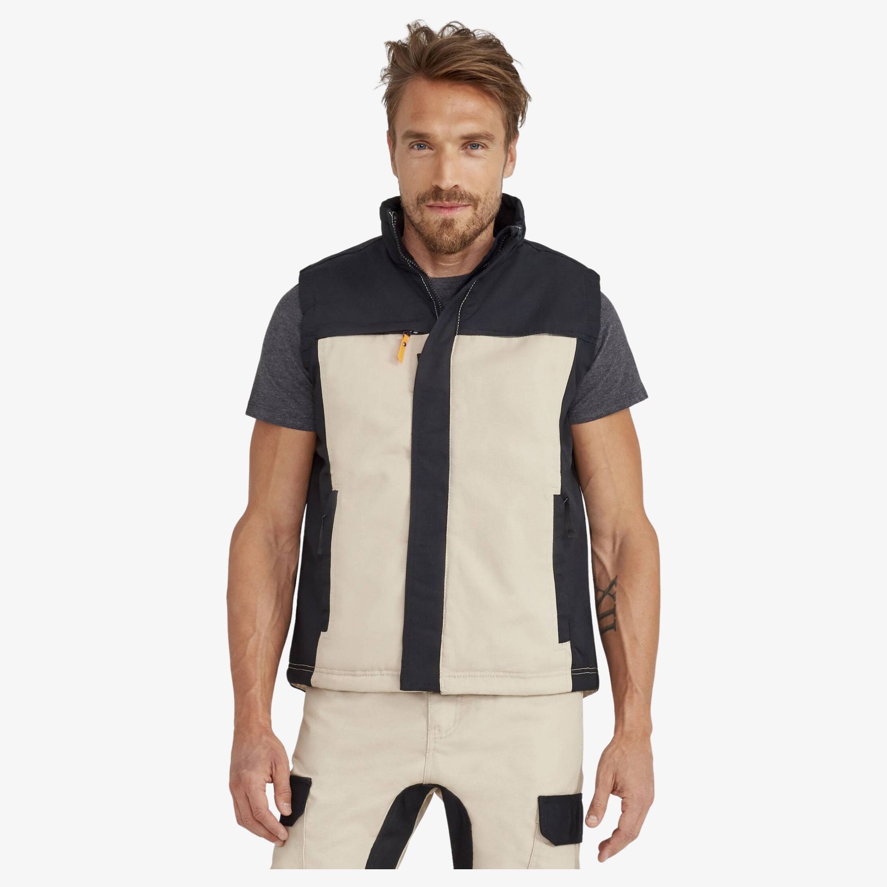 The two-tone bodywarmer combines polyester and cotton for workwear use. It features a polar fleece lined stand-up collar and a zip opening with protective flap. Four pockets are integrated, including one inside. A reflective piping is placed on the back, complemented by an inner drawstring and elasticated armholes.