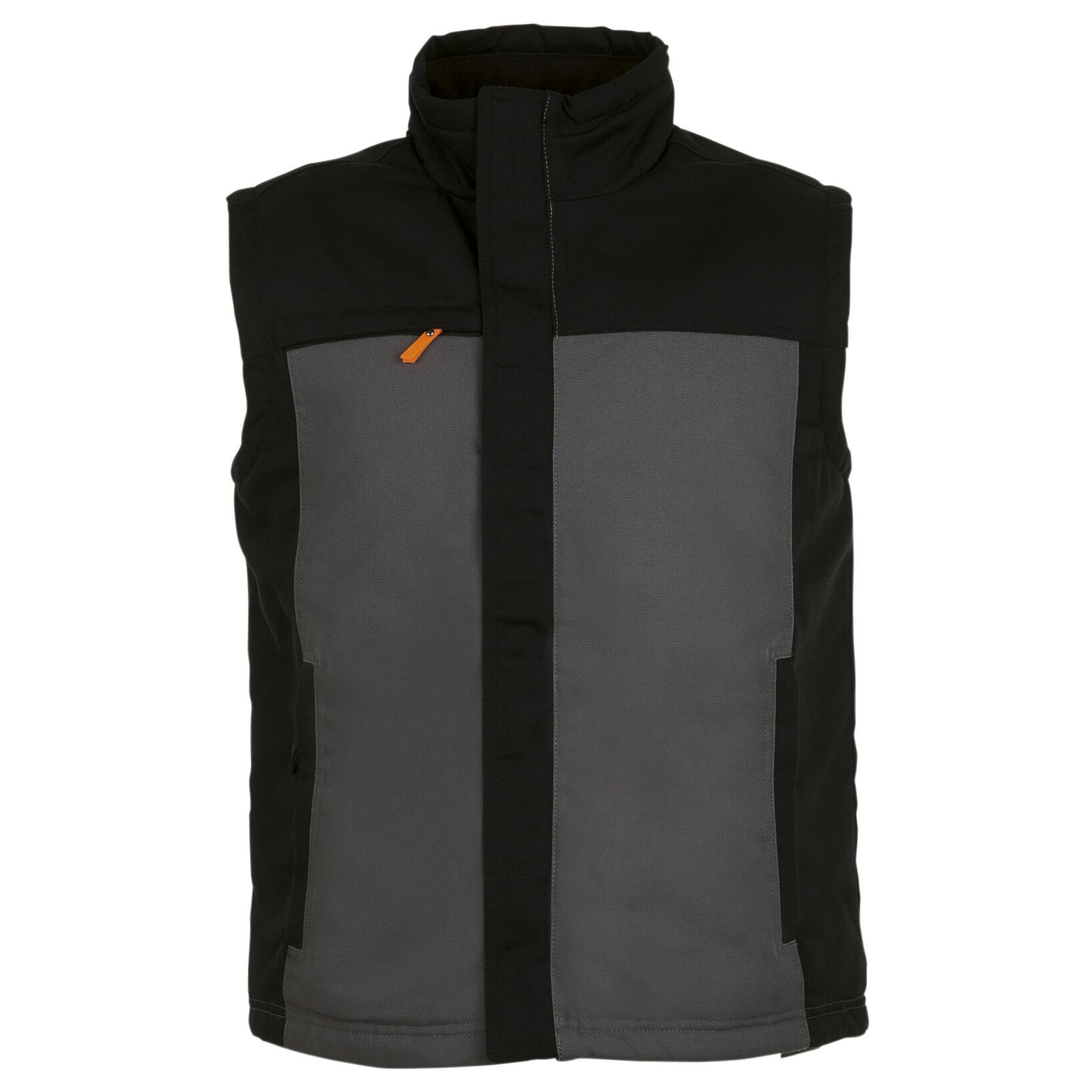 The two-tone bodywarmer combines polyester and cotton for workwear use. It features a polar fleece lined stand-up collar and a zip opening with protective flap. Four pockets are integrated, including one inside. A reflective piping is placed on the back, complemented by an inner drawstring and elasticated armholes.