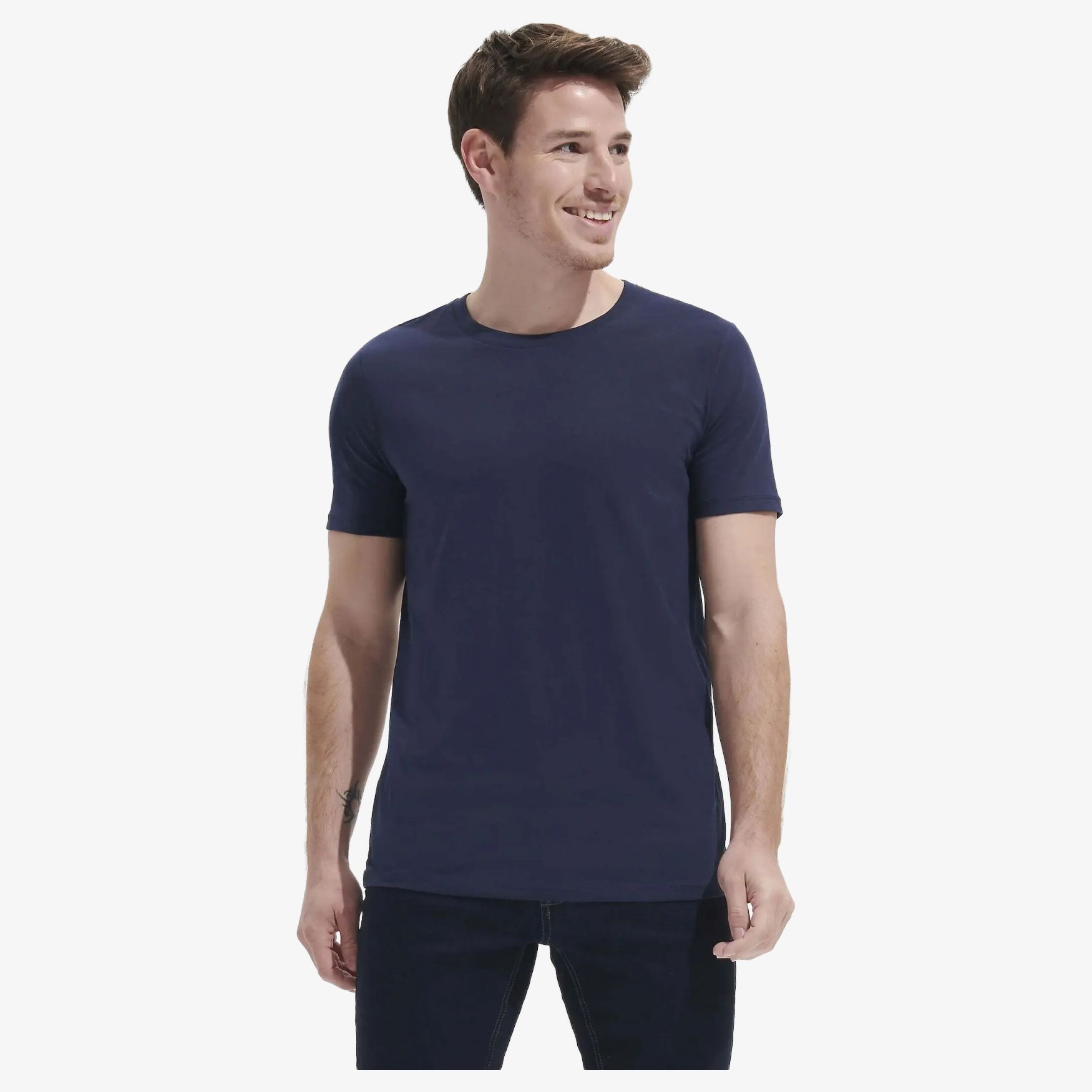 Men's round neck T-shirt. Jersey 190. 95% combed and ring-spun cotton. 5% elastane. Neck binding. Elastane ribbed collar. Round neck. Cut-and-sew. Stretch.