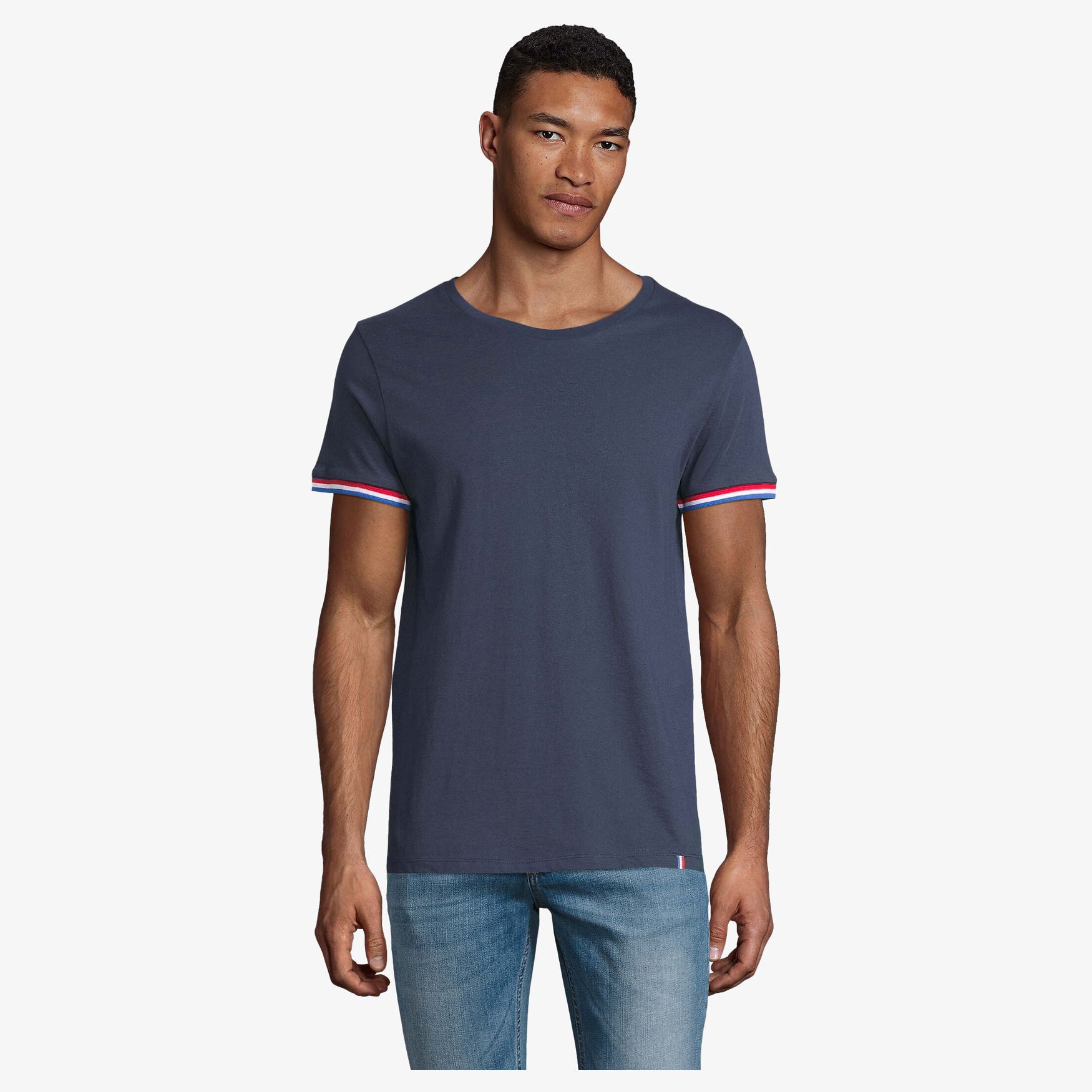 The men's short-sleeve tee-shirt Rainbow Men features a 1x1 tubular ribbed round neck and short sleeves with 1x1 ribbed hem with contrasting stripes. A neck tape is integrated into the collar. Made of 100% semi-combed Ringspun cotton, it combines simplicity and functionality.