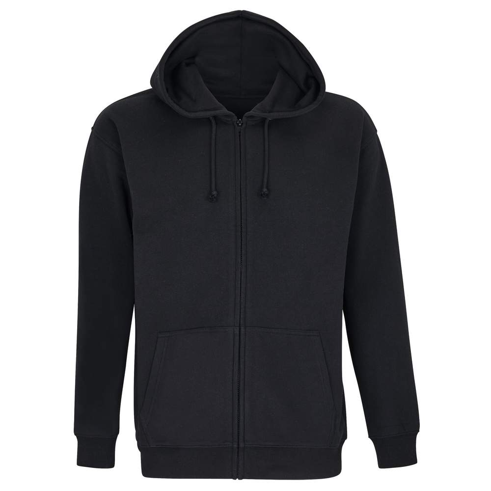 Unisex zip-up hooded jacket. Set-in sleeves. Sewn construction. Ribbed cuffs and hem. Kangaroo pocket. Hood with drawstring and metal eyelet. Main opening with covered zip. Plastic injection zip with metal pull tab. Half-moon and neckband in jersey.