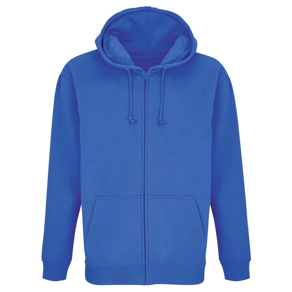 Unisex zip-up hooded jacket. Set-in sleeves. Sewn construction. Ribbed cuffs and hem. Kangaroo pocket. Hood with drawstring and metal eyelet. Main opening with covered zip. Plastic injection zip with metal pull tab. Half-moon and neckband in jersey.