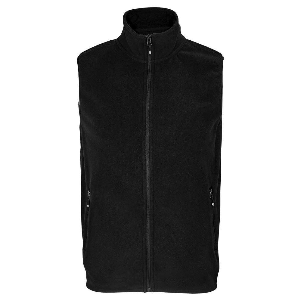 Zippered sleeveless unisex microfiber vest. Zipped side pockets and main opening with contrasting zip pull. Reinforced band on collar. Elastic bias at armholes and bottom of body.