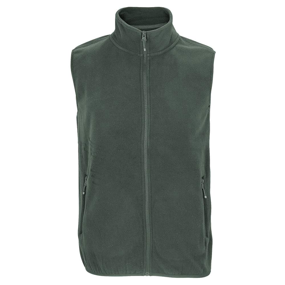 Zippered sleeveless unisex microfiber vest. Zipped side pockets and main opening with contrasting zip pull. Reinforced band on collar. Elastic bias at armholes and bottom of body.
