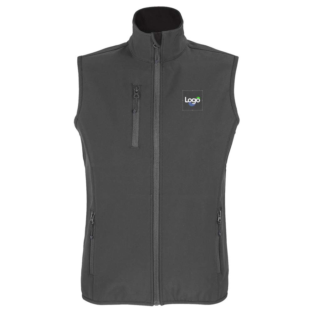Women's zipped sofshell sleeveless jacket. Zip closure. 2 side pockets and 1 zipped chest pocket. Contrast zip pulls. Elastic bias on armholes and bottom. Composition: 94% recycled polyester - 6% elastane. 3 layers. Polar fleece interior: 100% polyester. Waterproof and breathable membrane. Possibility of customization with embroidery for unique marking. Technical specifications: Composition: 94% recycled polyester - 6% elastane Interior polar fleece: 100% polyester Membrane: Waterproof and breathable Number of layers: 3
