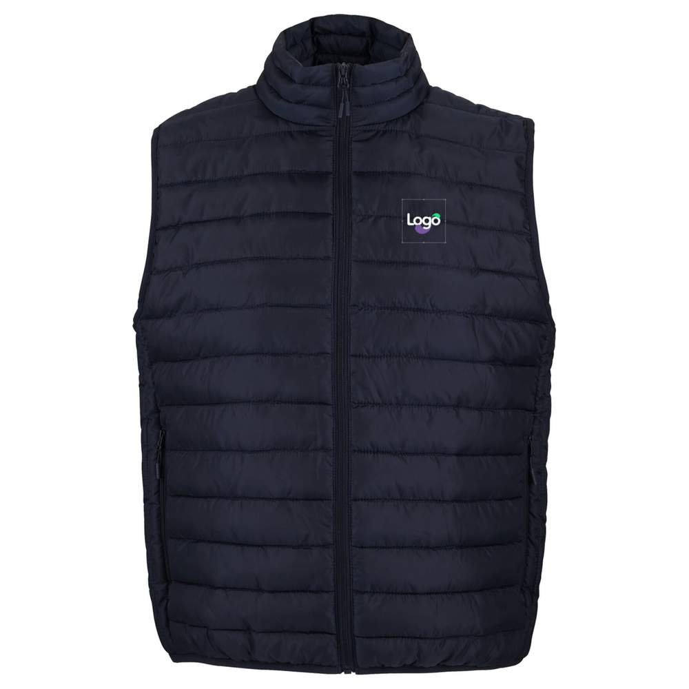 Lightweight sleeveless jacket for men. Main opening and side pockets with ton-on-ton nylon zip. Metal ton-on-ton pullers with black fantasy zip pull. High collar. Bottom of garment and armholes with ton-on-ton elasticated bias binding. Storage bag. Composition: exterior and lining 100% polyester; padding in 100% polyester down. This model is ideal for customization by embroidery, allowing the addition of your logo or your visuals for effective and original communication.