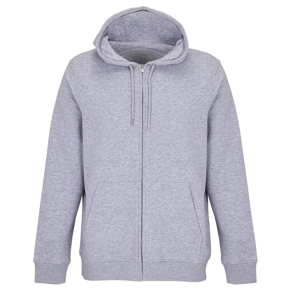 Unisex zipped hooded jacket. Sewn fit. Set-in sleeves. Cuffs and hem with ribbing. Kangaroo pocket. Hood lined with jersey. Drawstring with eyelet and metal tip. Main opening with covered zip. Zip and pull-tab in metal. Half-moon and neckband in jersey. Composition: 85% organic combed cotton, in conversion, 15% recycled polyester; 3 threads; inside not brushed; outside 100% organic cotton, in conversion.
