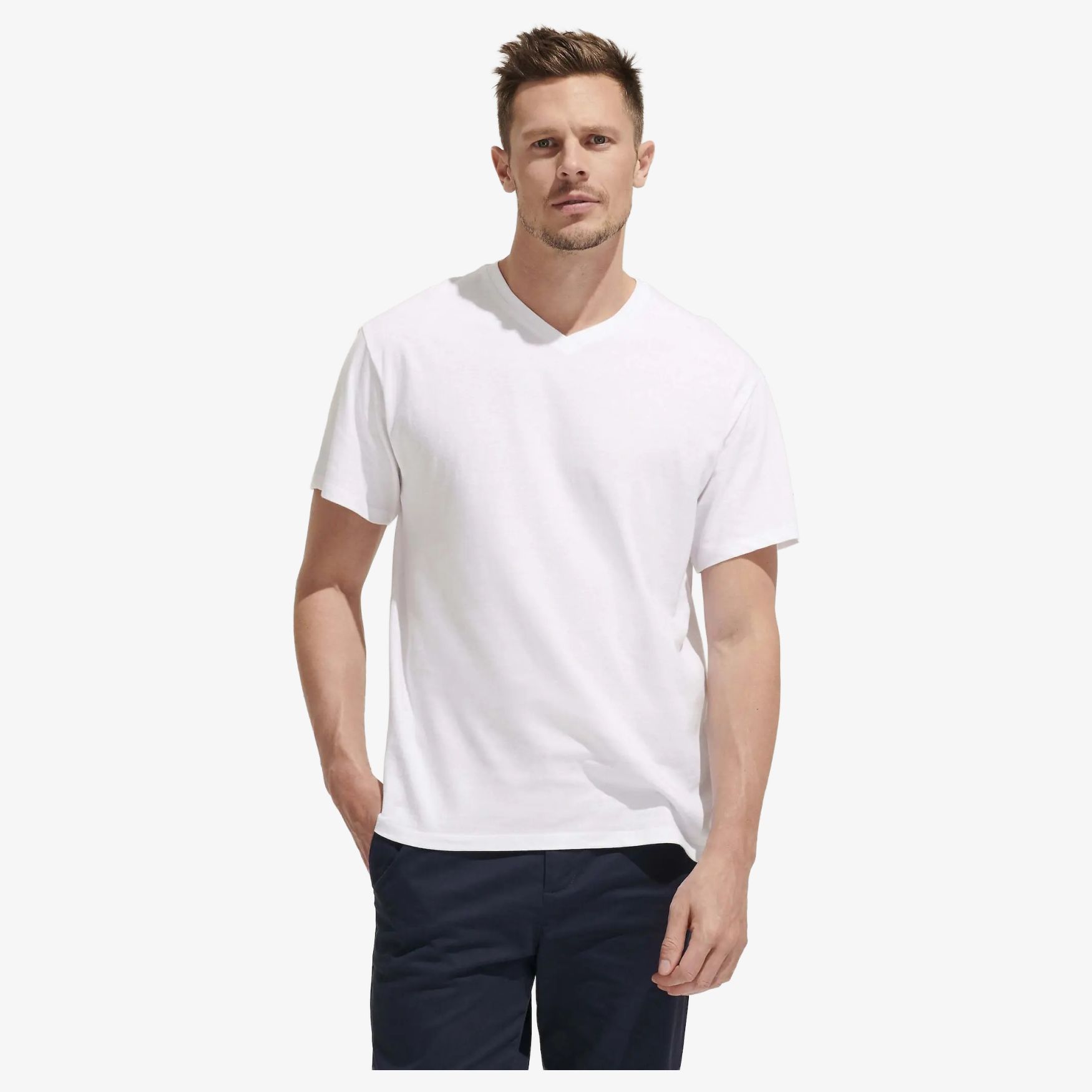 This men's t-shirt in jersey offers optimal comfort thanks to its 100% semi-combed cotton composition. Its classic cut and V-neck make it a versatile piece for all occasions. The neckband ensures a neat appearance. Its tubular construction guarantees increased durability.