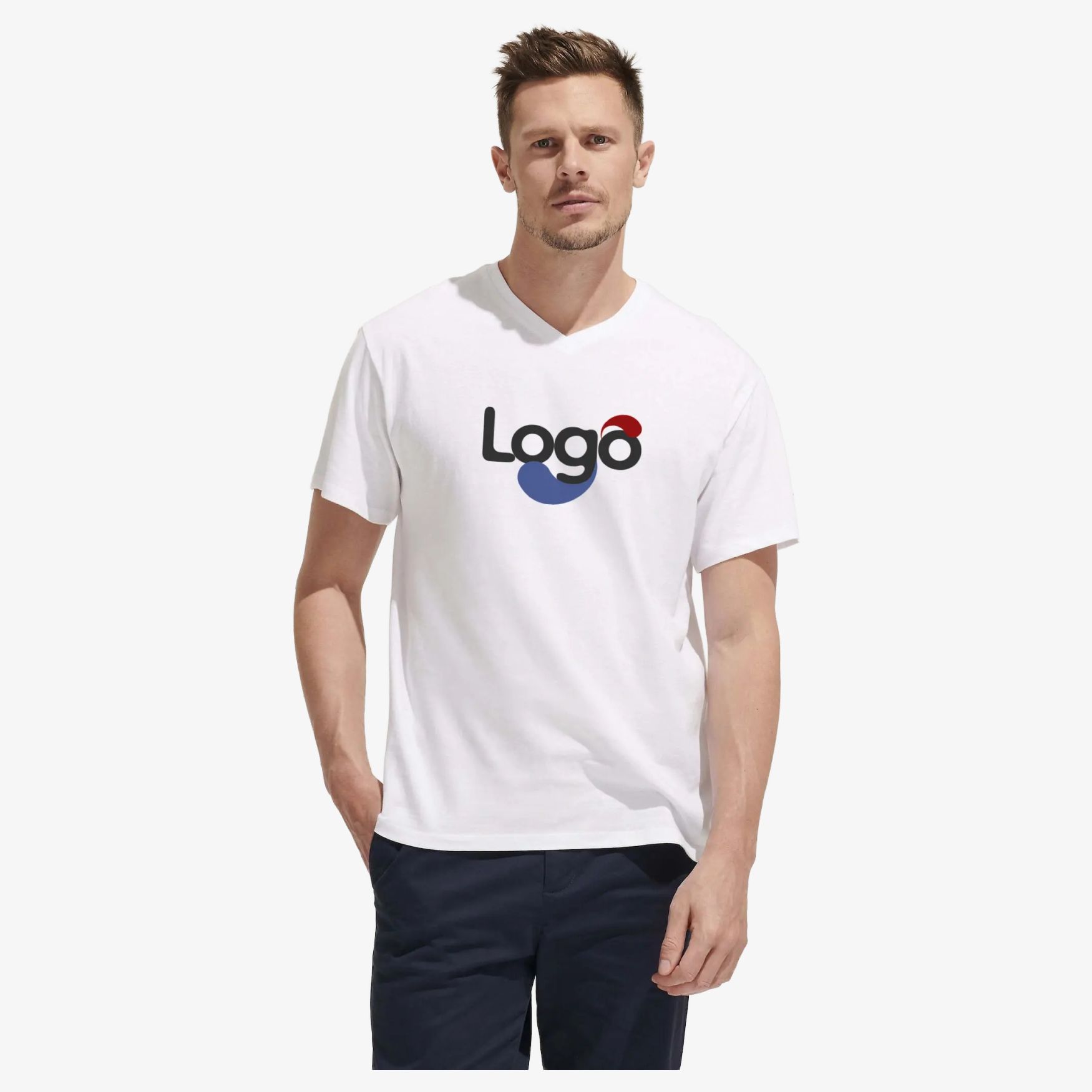 This men's T-shirt features a classic fit and a V-neck. It is made of jersey 150, 100% semi-combed cotton, offering optimal comfort. The neck tape and the four layers of ribbed edge ensure lasting durability. This tubular model is ideal for easy and high-quality customization.
