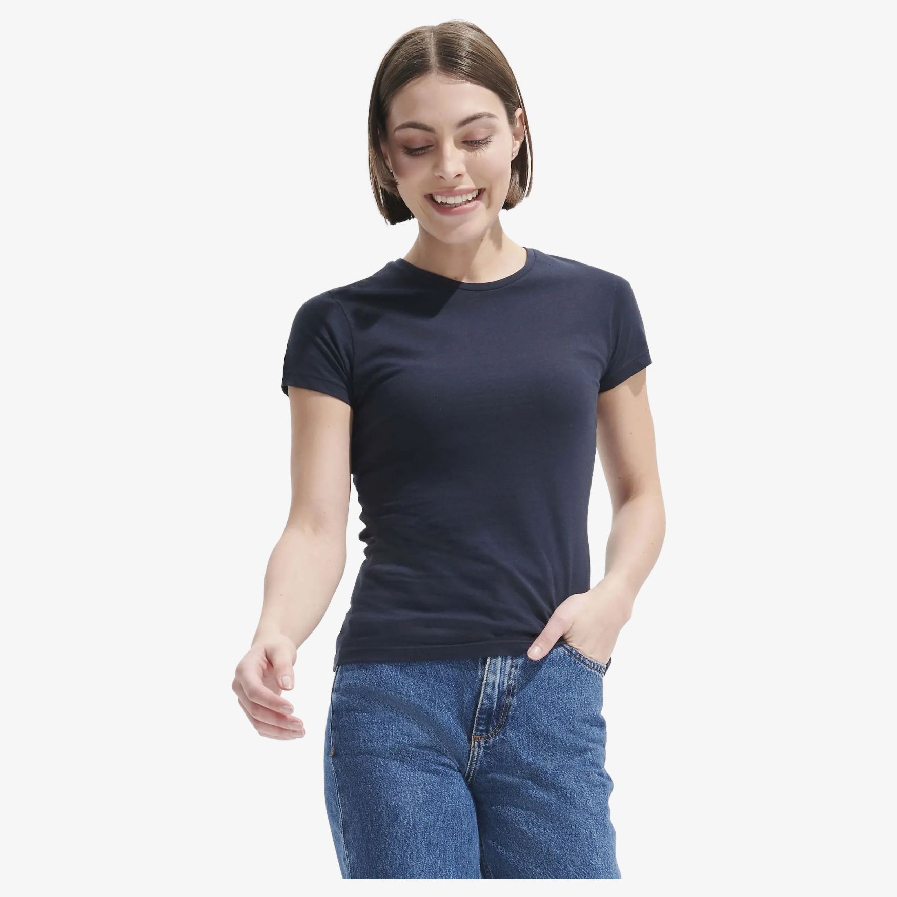 This women's t-shirt is made of semi-combed 100% cotton jersey, offering optimal comfort and good hold. It features a fitted cut that highlights the feminine silhouette, as well as a classic jersey neckline. The collar has a neat band for a finished and durable look. This t-shirt is designed for a feminine style and modern appearance.