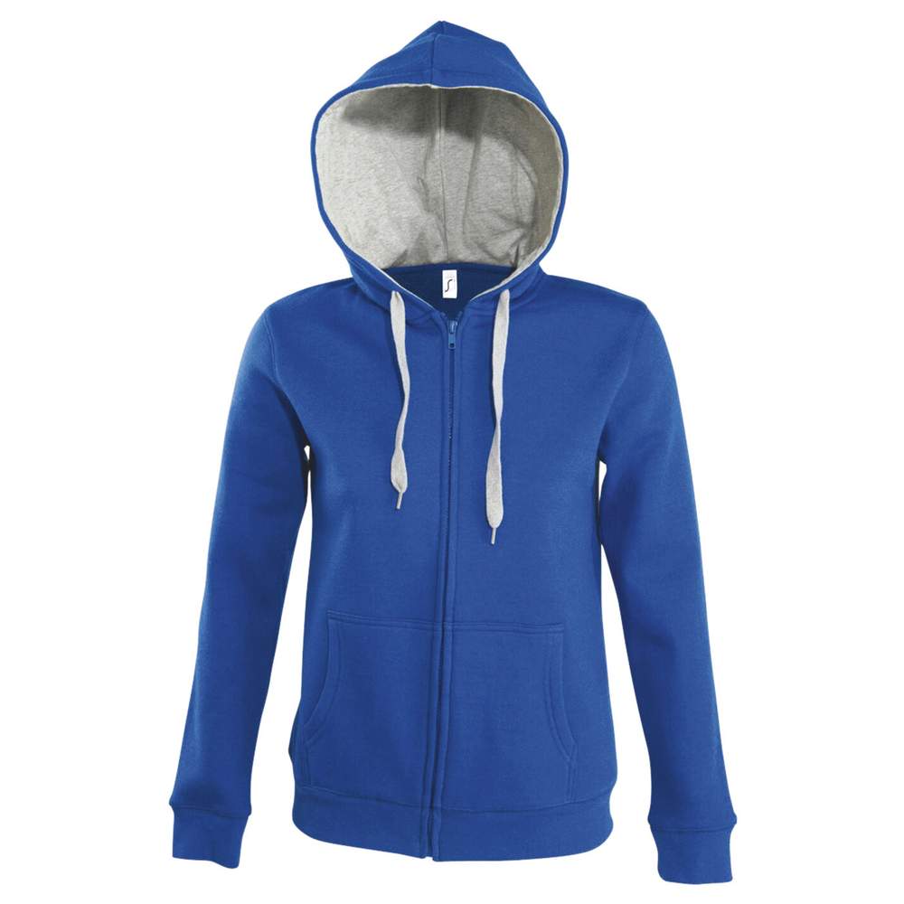 Bicolor women's zip-up jacket, featuring a contrasting lined hood. The inside is made of fleece for added comfort. It has set-in sleeves and two practical kangaroo pockets. The hem and cuffs are in elasticated ribbing for an optimal fit. The cut is fitted for a flattering silhouette.