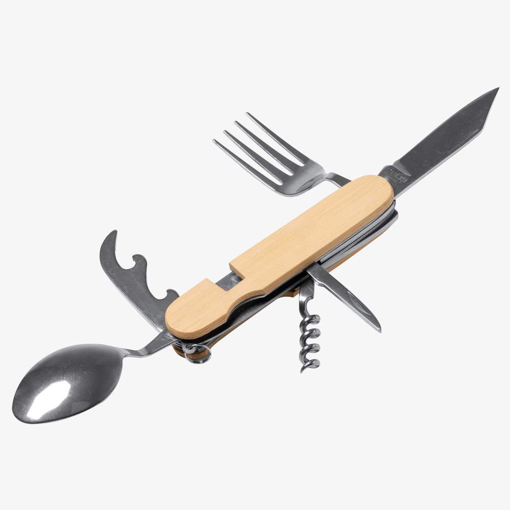 Multifunction cutlery set with bamboo structure and stainless steel accessories. This set includes a corkscrew and a pocket knife, offering a compact and versatile solution for various situations. Packaging is ensured by an eco-design box, favoring reduced environmental impact. Dimensions: 3.5 x 11 x 3 cm. Composition: bamboo, stainless steel.
