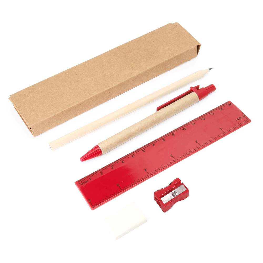 This set includes a pen with a cardboard body and blue ink, a wooden pencil, a pencil sharpener, an eraser and a 15 cm ruler. The set is presented in a kraft cardboard box.