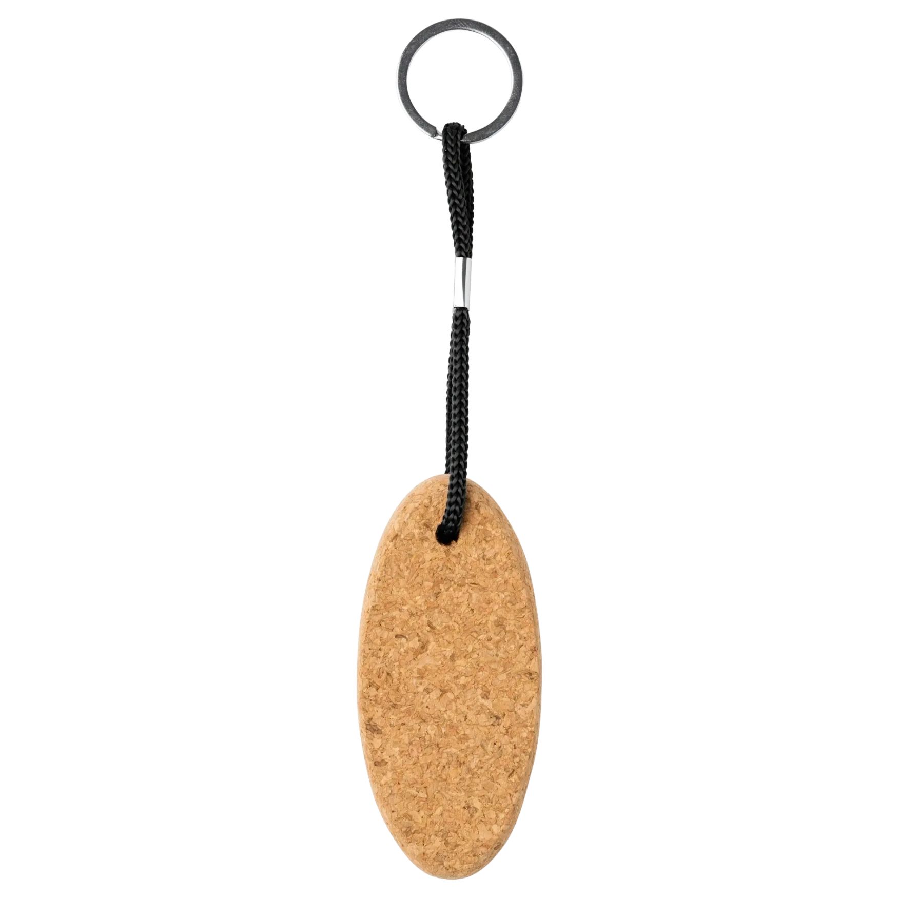 The oval floating keychain is made of natural cork with a durable polyester cord guaranteeing the keys' buoyancy in case of water drop. This model is suitable for use during water activities or by the seaside.
