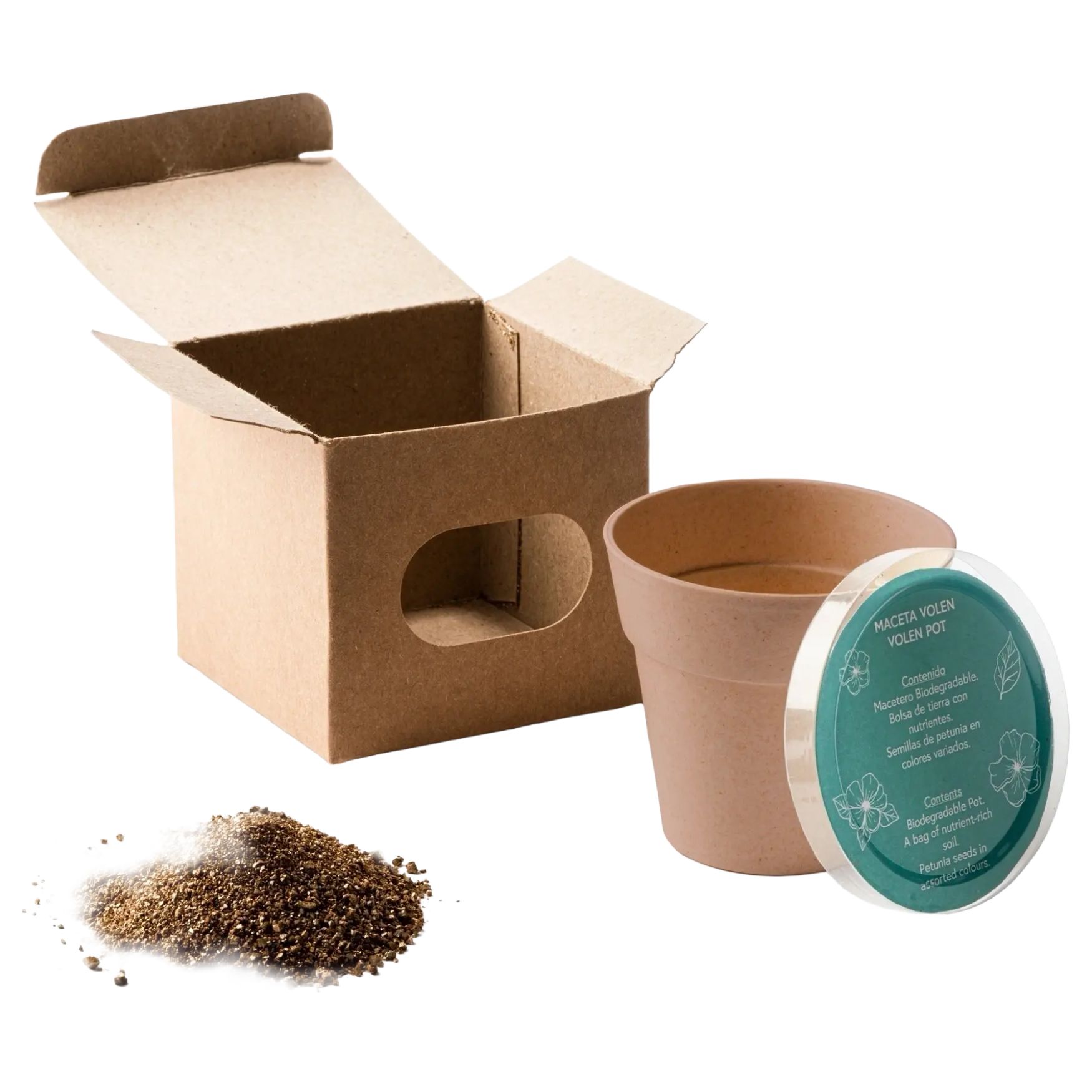 The VOLEN biodegradable pot includes petunia seeds and a substrate suitable for container gardening. This pot is designed to naturally decompose after use, reducing plastic waste.
