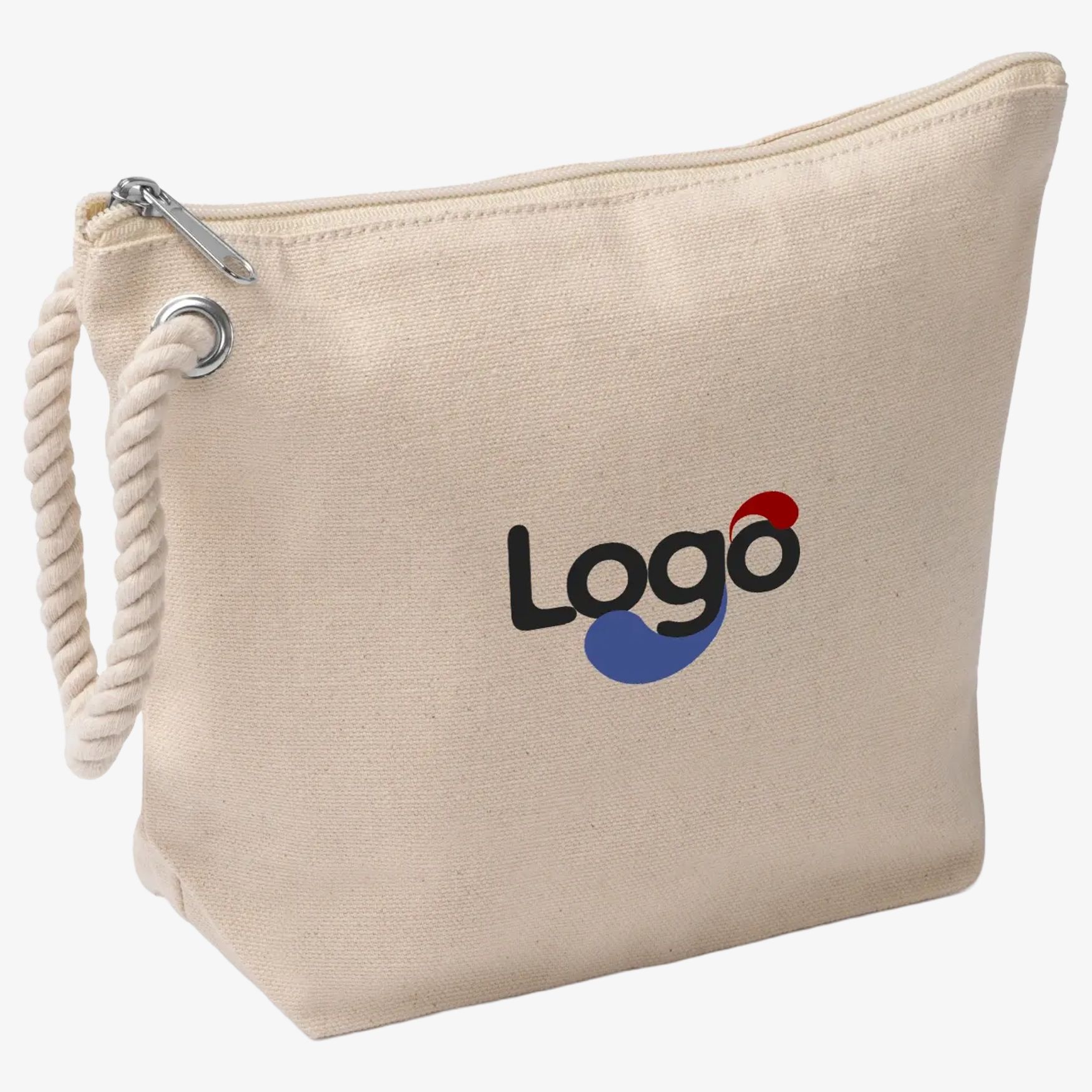 The NAUTY pouch bag is made of 100% cotton with a nautical style handle. It measures 8 x 18 x 24 cm and allows practical storage for various personal items. Customization is possible.