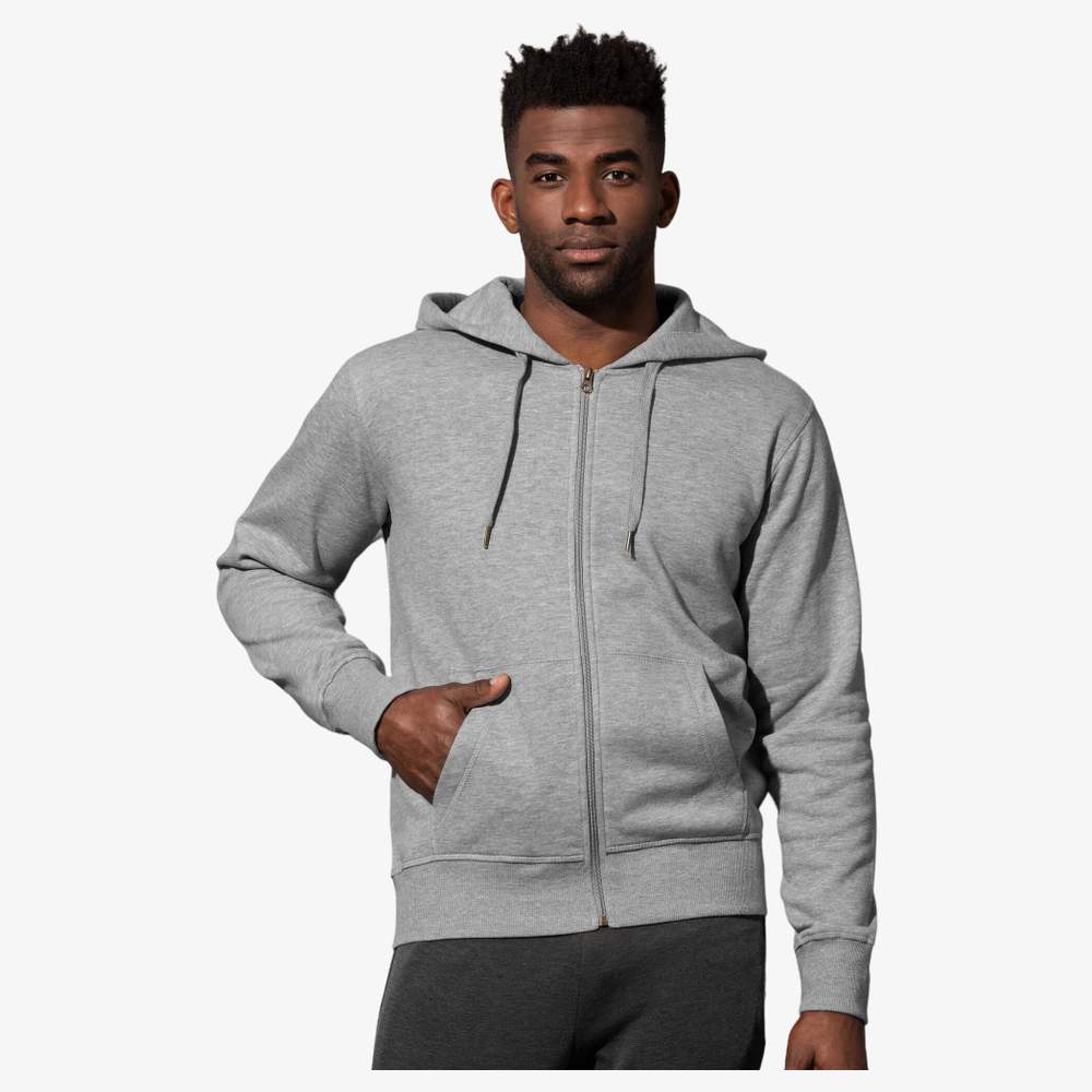 Men's modern and sporty cut hooded jacket made of medium-weight cotton-polyester blend with kangaroo pocket, modern ribbed bands and wide drawstring. The brushed interior provides extra warmth. Surface 100% cotton, modern design with metal zip and slider, soft cotton blend, brushed fleece interior, no brand label in the neck. Surface 100% cotton, brushed fleece interior, lined hood, wide drawstring with metal tips, metal eyelets for the drawstring, decorative flatlock seams, front pocket, ton-on-ton zip with metal slider, wide ribbed band with elastane at the base of the sleeves and edge, neatband, side seams, small size label in the neck, care label in the side seam.