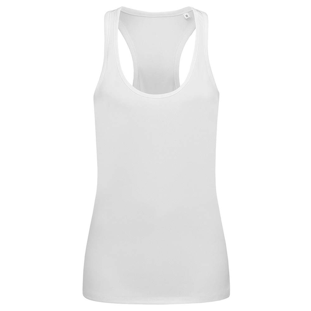 Women's form-fitting sport tank top with functional mesh back, quick-drying and breathable. Excellent moisture control, lightweight and elastic mesh fabric, no brand tag in the neck. Bird-Eyelet Mesh, ACTIVE-DRY: quick-drying functional material with excellent moisture regulation and breathability, stretchable material, racerback, neckline and armholes with trim, side seams, small size tag in the neck, care label in the side seam.