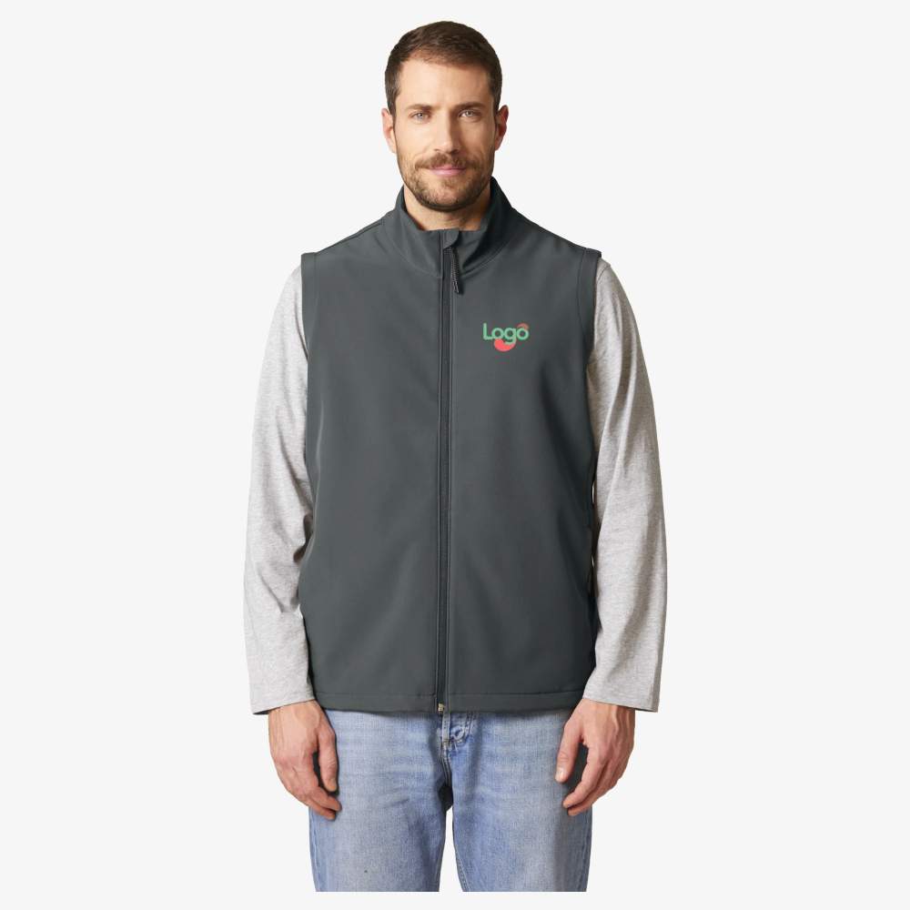 The softshell jacket without sleeves for men Stanley trail blazer offers optimal comfort thanks to its high collar and anti-pill fleece layer. The bottom hem with stopper and adjustable elastic cord ensures a personalized fit. It is equipped with a reversed nylon zipper, zipped welt pockets with elastic reflective pull tab and side panels for a better shape. The inner seams are finished with recycled bias tape and the bottom hem is water-repellent. Its composition of 94% recycled polyester and 6% elastane gives it breathable and windproof properties. This jacket is ideal for customization by embroidery, allowing you to add your logo or your visual for effective communication. Breathable, windproof, water-repellent, high collar, bottom hem with stopper and adjustable elastic cord, inner seams finished with recycled bias tape