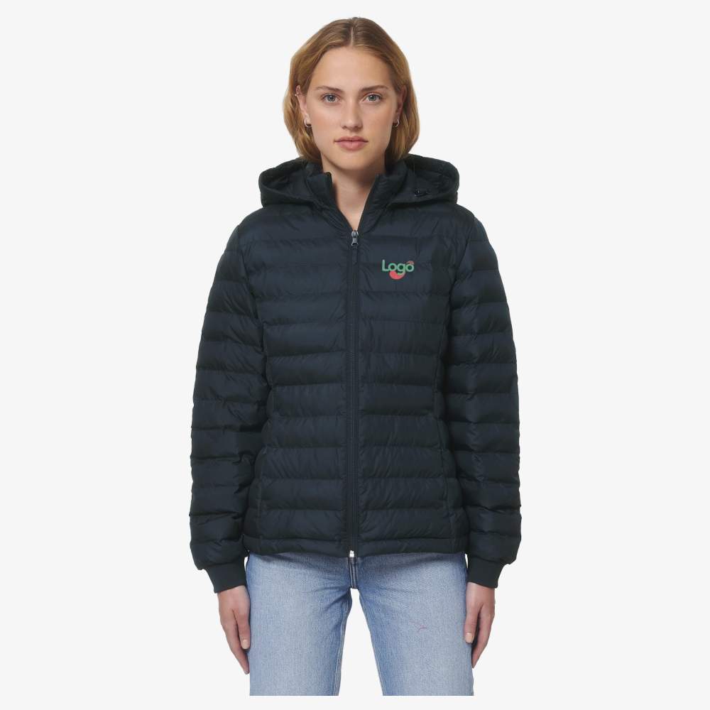 The women's quilted jacket Stella Voyager STANLEY STELLA offers optimal comfort thanks to its careful design. It features raglan sleeves, a high collar with a detachable hood, and matte invisible metal snap buttons. The hood and the bottom of the body are adjustable with a plastic stopper and an elastic cord. A reverse zipped nylon closure ensures a central closure. The piping pockets with extra large grosgrain closures offer practical storage space. Fully quilted, this jacket is equipped with side panels for a flattering cut and a soft 1x1 ribbed bottom. The interior seams are finished with an edge for greater durability. The composition includes an outer fabric made of 100% recycled polyester with durable water-repellent treatment without fluor, a filling made of 100% recycled polyester, and a lining made of 100% recycled polyester fabric also with durable water-repellent treatment without fluor. This jacket is customizable, allowing the addition of your logo or your visual by embroidery. Exterior: 100% recycled polyester. Filling: 100% recycled polyester. Lining: 100% recycled polyester