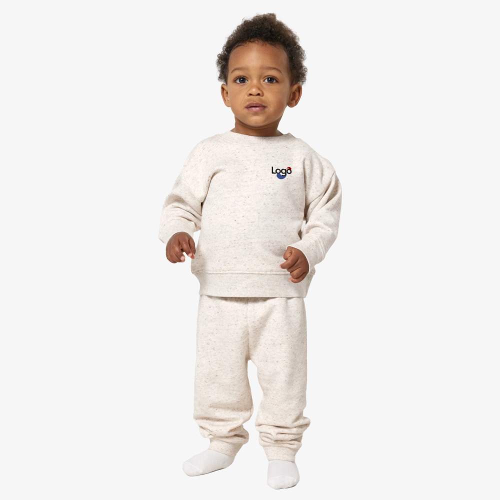 This Iconic round neck baby sweatshirt is designed to offer comfort and style. It features set-in sleeves, a ribbed collar, cuffs and hem for an optimal fit. The shoulder is equipped with 1 ton-on-ton snap button and 1 invisible snap button for easy dressing. A jersey single-neckband is integrated inside the collar, and a half-moon in the main material is found inside the collar. Single stitching on the collar and double stitching on the cuffs and hem enhance the durability and aesthetics of the garment. This sweatshirt is customizable, allowing you to add your logo or design for a unique touch. Composition: 85% organic cotton combed and spun, 15% recycled polyester.