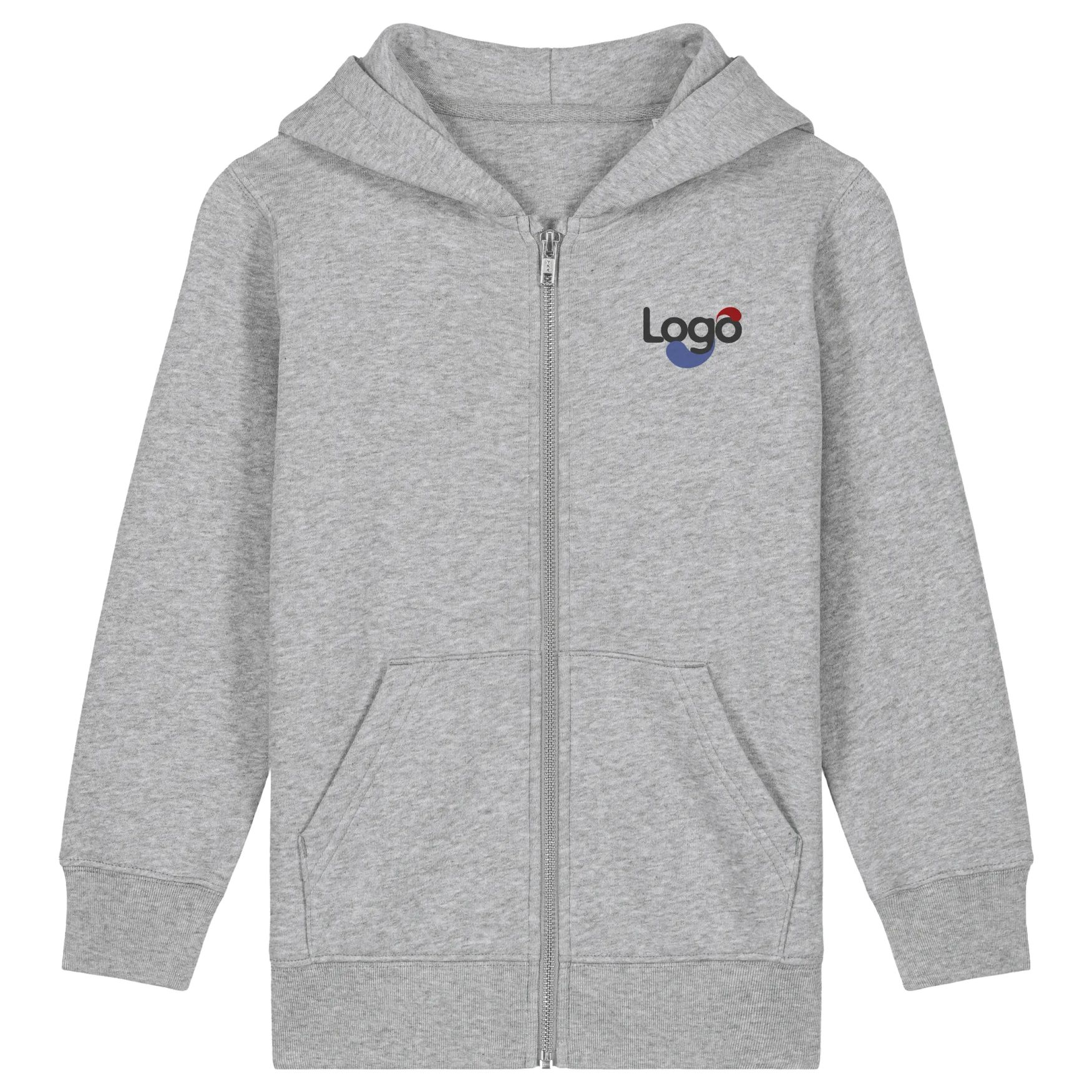 The iconic children's hooded sweatshirt with full zip closure. Set-in sleeves. Hood lined in the main fabric. Single jersey band at the inner seam of the back neck. Half-moon in the main fabric at the back of the neck with a 3 mm twin needle. Single stitching at the neck seam. 1x1 rib at the sleeve hem and bottom hem. Centered double-needle stitching at the hem, wrist, and armhole. Kangaroo pocket with a 3 mm single-needle stitching. Visible metal zipper closure in the middle front. Composition: 100% organic combed and ring-spun cotton. This hooded sweatshirt is customizable, offering the possibility to add your logo or a unique design with embroidery.