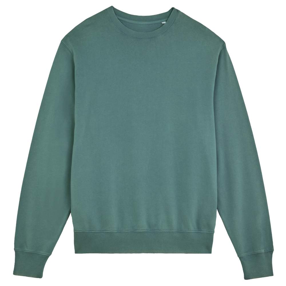 Unisex medium fit round neck terry sweatshirt with a faded effect. Set-in sleeves. Ribbed 1/1 finish at collar, cuffs, and bottom of the sweatshirt. Chevron neck tape at the back neck. Half-moon insert in the main fabric at the back neck. Topstitching at the collar. Double topstitching at the armholes, cuffs, and bottom of the sweatshirt. Garment dyed after manufacture, each garment may vary in appearance. The garment is slightly darker at the seams. May bleed, follow the care instructions on the label. Composition: 100% organic combed and carded cotton. This sweatshirt offers an excellent base for embroidery customization, allowing you to integrate your logo or visual for effective and durable communication.