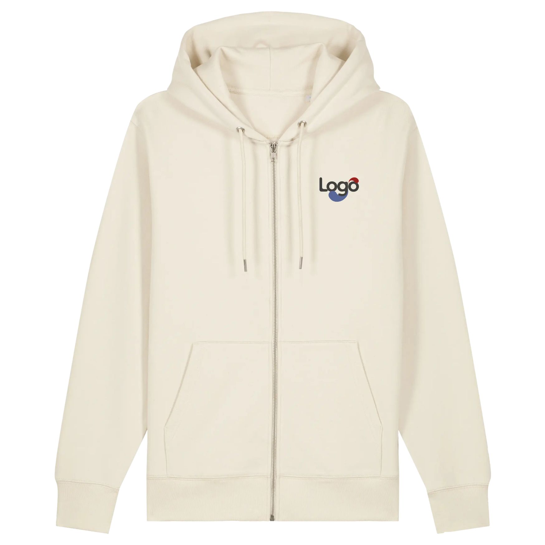 The Cultivator 2.0 is a unisex zipped hooded sweatshirt in organic combed and ring-spun cotton. It features raglan sleeves, a double-lined hood, round drawcords, metal grommets, a chevron strip, a half-moon at the back of the neck, and double-needle stitching. It has 1x1 ribbed cuffs and hem, as well as a kangaroo pocket. Its center-front visible zipper closure ensures easy wear. This garment is designed to be customized, whether by embroidery or by adding your logo, thus offering an ideal solution for displaying your visual identity.