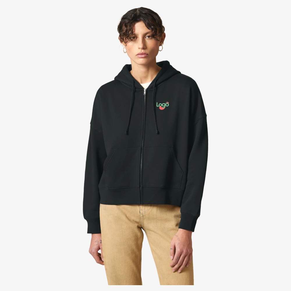 The Stella ida zippered hoodie for women offers optimal comfort thanks to its composition in 100% organic cotton combed and carded. Its raglan sleeves and dropped shoulders give it a modern and flattering fit. The double-layered hood, matching the body of the sweatshirt, provides additional protection. A flat cord of the same color allows you to adjust the hood according to your preferences. The 1x1 ribbing at the collar, cuffs, and hem ensure a comfortable fit and good hold. Double stitching on all seams reinforces the durability of the garment. A grosgrain tape inside the collar adds a touch of sophistication, while the half-moon of fabric at the back of the neck ensures optimal comfort. This zippered sweatshirt is also customizable, allowing you to add your logo or your visual by embroidery for effective and personalized communication.